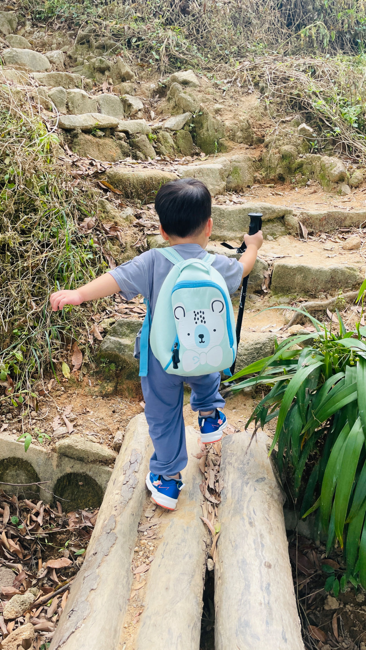 带上装备,差不多十点开始登山,手作步道平缓处是原生态的没有用水泥或砖块硬化处理的红土地,陡一些需要阶梯的,使用木头铺设成一级级台阶,路上还间或有沿山势而成的泄水沟渠,也以树干架桥。开始的一段是穿过一片荔枝林,沿途悬挂了一些在上一果季中给登山者的提示标牌“私人果园,请勿采摘”“荔枝可帮邮寄,采摘请联系xx”…依着安安的节奏,我们爬一段休息一段,说是休息,其实是停下来打开书包挑零食吃。平常零食限量,户外登山,安安自己走的话妈妈许以零食自由。就这样悠哉悠哉地爬了两个小时,来到了一段比较陡峻的路段,小家伙手脚并用,慢慢地爬过一级级的台阶,妈妈在后面保护,需要时托举帮助,我在前面拍照记录。